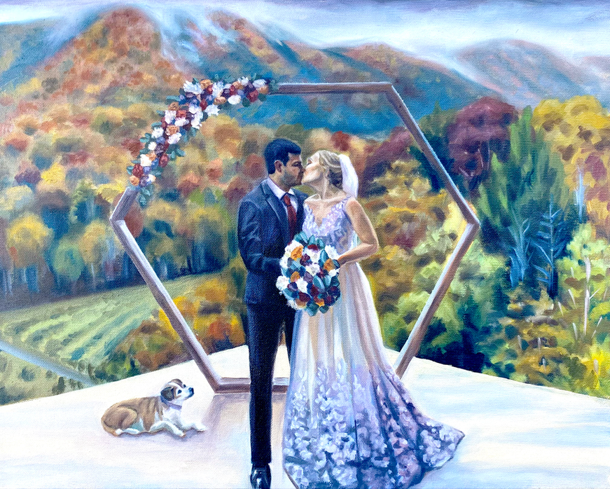 On your wedding day, I will arrive a few hours early for setup. During your first look or after your ceremony, I will walk you through a brief photoshoot. This is to ensure I have a high quality and organic reference image for the painting. At the end of the night, you will be gathered for the final reveal.